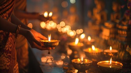 Devotees Lighting Candles for Vesak. In the warm glow of candlelight, devotees are seen lighting oil lamps during Vesak, creating a path of flame that signifies enlightenment and hope
