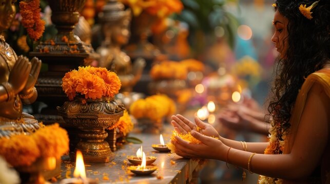 Traditional festive indian temple courtyard with marigold garlands, vishu festival