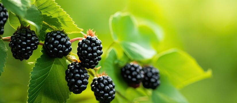 A bunch of ripe blackberries growing on a bush against a blurred green backdrop