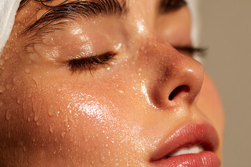 Golden dewy skin closeup showing moisturized cheek with water droplets and glossy lips