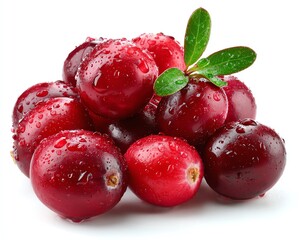 Fresh cranberries with droplets and leaves.
