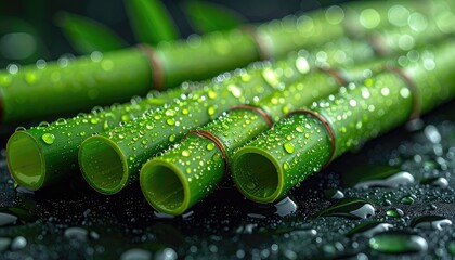 Glistening dewy green leaves with water droplets and soft bokeh macro close-up