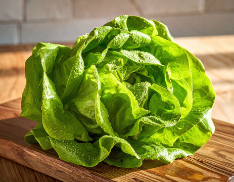 Vibrant green lettuce head with dewy water droplets on a wooden board in bright morning sunlight. Ideal for organic health content, culinary designs, and fresh farmtotable lifestyle concepts.