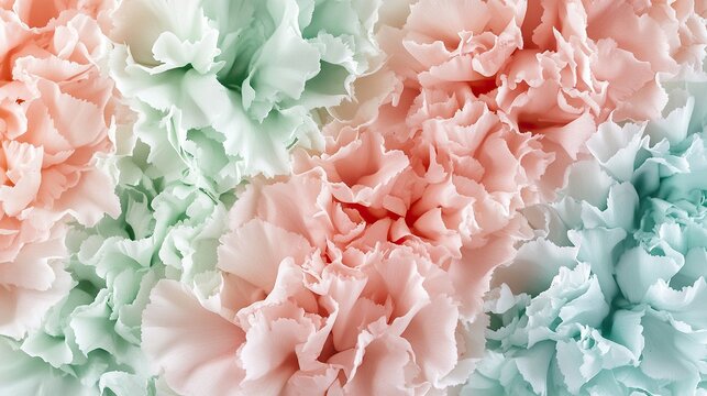 A dewy close-up view of pastel carnation petals clustered together in harmonious shades of blush pink