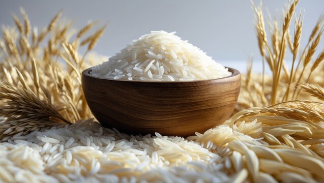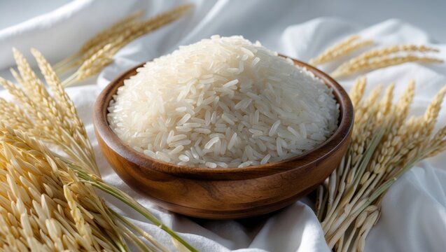 Wheat Grains in Wooden Bowl isolated on white background, wheat ears golden colour, harvest wheat concept.