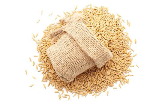 Close-up of organic Rice with Bran (Oryza sativa) or Dhaan in a jute bag on a heap of Rice Bran, isolated on a white background.