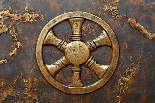 Ornamental golden dharma wheel on a textured metal surface with detailed design
