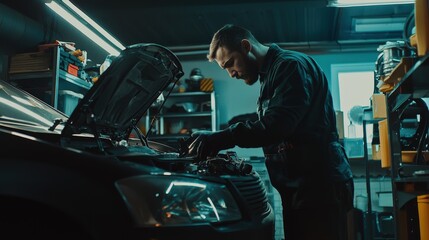 Automobile mechanic engaged in car maintenance with the help of diagnostic equipment and devices