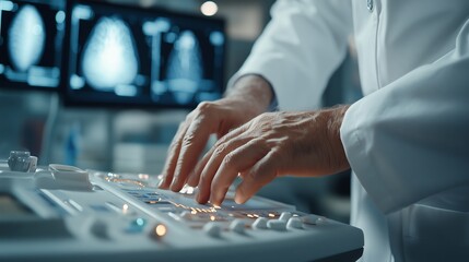 A medical professional operates ultrasound equipment in a healthcare setting. The image captures the intricate process of diagnostic imaging, showcasing focus and expertise.