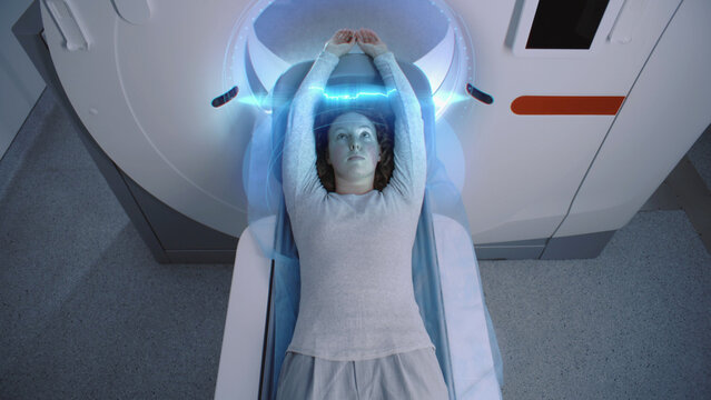 Female patient undergoes MRI or CT scan, lies on bed moving inside machine. Visual effects of scanning brain and body of woman. High-tech augmented reality and futuristic equipment in advanced clinic.