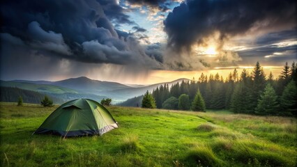 A solitary tent stands steadfast in a lush green meadow, raindrops glisten on its fabric, surrounded by misty atmosphere and dark grey clouds.