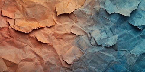 Crumpled paper texture in shades of orange and blue with a diagonal division, rich shadows and depth for creative backgrounds or designs.