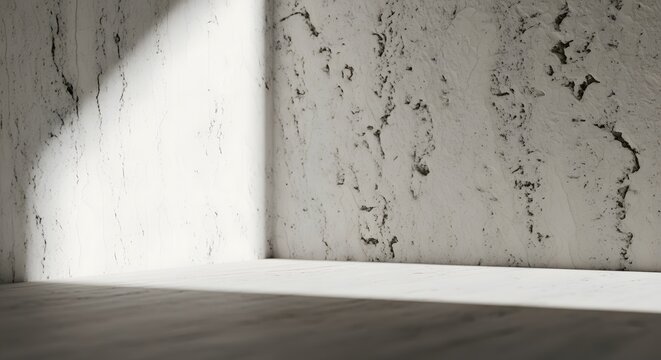 Sunlight streaming through a window casting dramatic diagonal shadows on a textured wall and floor