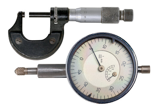 A micrometer for making precision measurements and a dial gauge for shaft runout measurements on an isolated background.
