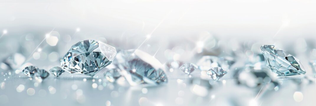 Multiple white diamonds in a bright and airy composition, commercial photography with dynamic lighting, luxury background
