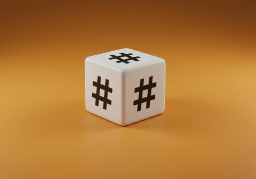 A single white dice with hash symbols on its visible faces sitting on a brown surface viewed from a slightly elevated angle.