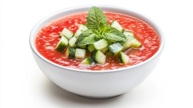 A bowl of refreshing watermelon gazpacho soup garnished with diced cucumber and mint leaves, Its vibrant color and refreshing flavor enticingly displayed