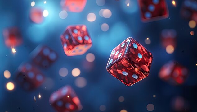 Red dice floating in the air, surrounded by sparks and bokeh
