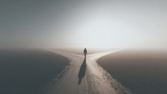 A solitary figure standing at a crossroads. The individual is positioned where the path forks, and the scene is enveloped in mist, creating a sense of introspection and decision