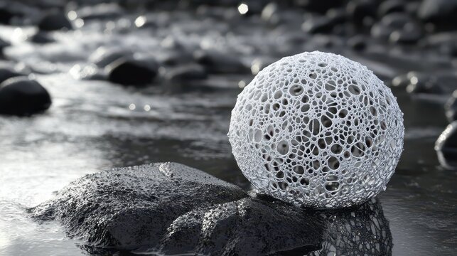 A delicate intricate sphere of lace like white metalwork rests on textured dark stones beside flowing water
