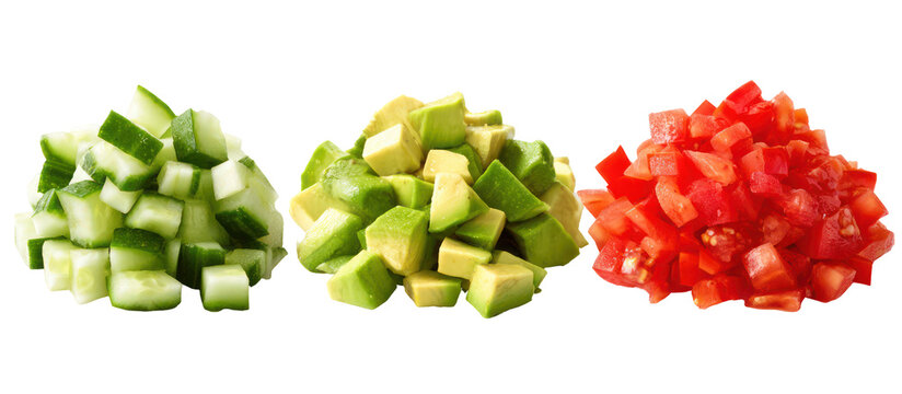 Three piles of diced vegetables including cucumber avocado and tomato isolated on transparent background