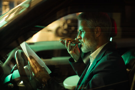 Mature businessman dictating voice message in car at night