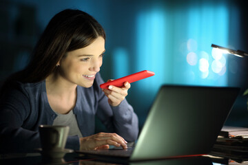 Woman laughing holding smartphone dictating voice message
