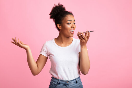 Voice Search. Emotional black girl using smart phone voice and talking, holding gadget near mouth
