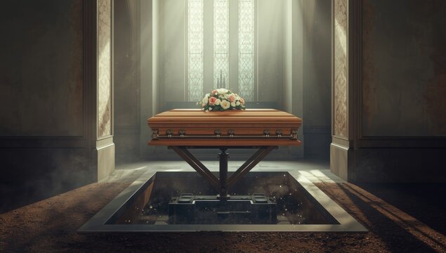 Wooden coffin displayed against a wooden background with colorful backlighting for Halloween decor
