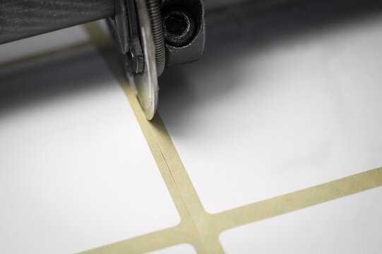 Rotating knives for cutting a self-adhesive label into several narrow ribbons. Equipment for the production of self-adhesive labels. Rotary die cutting machine with slitting blade. Selective focus