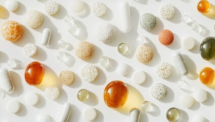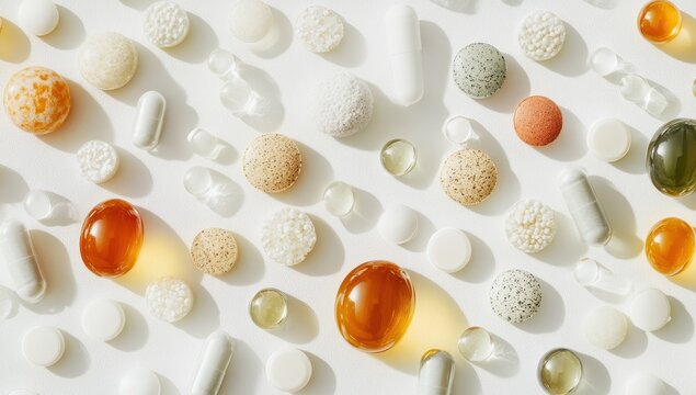 Visual display of assorted dietary supplements and vitamins in a jar on a soft blue background