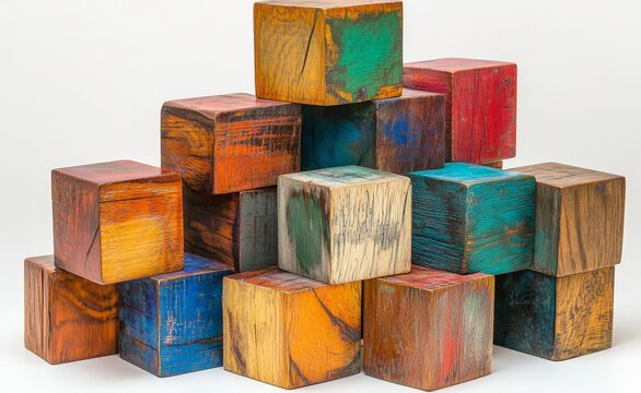 Wooden blocks haphazardly placed, each of a different color, on a white backdrop.