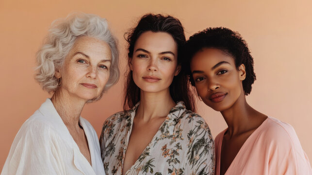 Three women of different generations pose together in front of a soft, orange background showcasing beauty and diversity in a studio setting