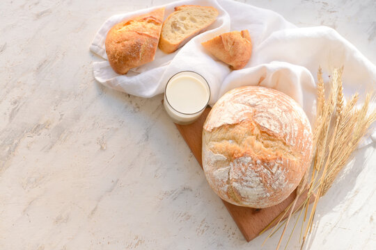 Different types of bread. Empty space in the center of the image is surrounded by different types of fresh bread. White background.