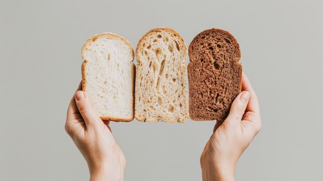 Hands holding three different types of bread slices showcasing variety and diversity of bread against a neutral background.
