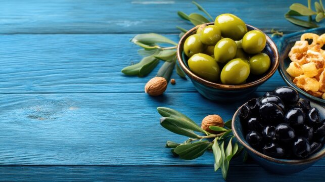 Blue background with a variety of food items including olives, nuts, and crackers. The bowls are filled with different types of food, and the overall mood of the image is inviting and appetizing
