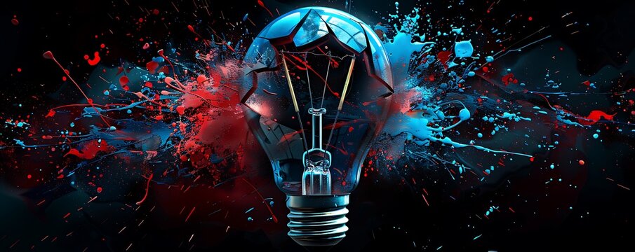 Creative light bulb explodes with colorful paint and splashes on a black background. Think differently creative idea concept