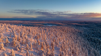 Mystical dawn over misty mountain silhouettes with pastel fog