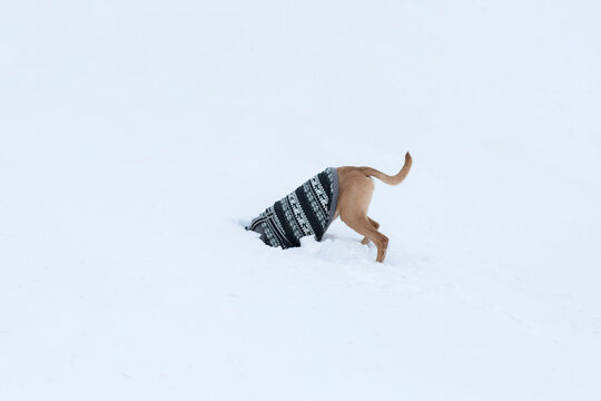 dog digs on the snow searching for something