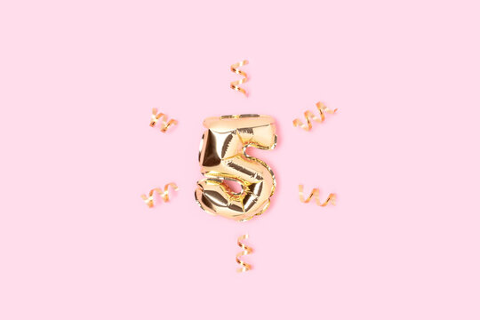 Number 5 golden air balloon with confetti on a pink pastel background.