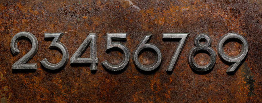 Backgrounds and textures: assorted metal digits on a rusty background, typographic art abstract
