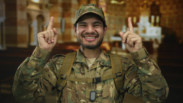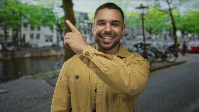 Young hispanic man with smiling face points finger toward camera on city street during daytime; confidence.