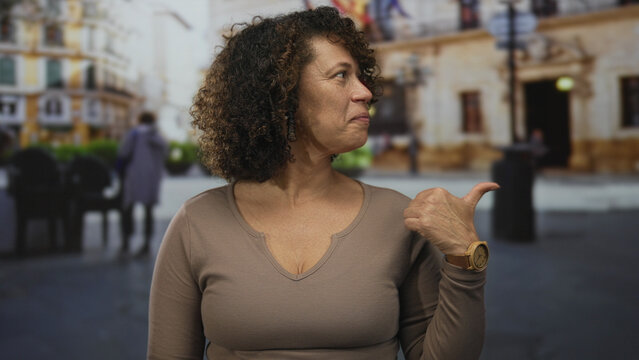 Middle aged hispanic woman wearing wooden watch pointing thumb on busy city street; playful invitation.