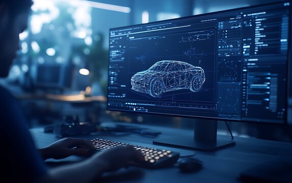 A designer works on a computer, drafting a digital car model with code and schematics displayed on a large monitor in a modern workspace.