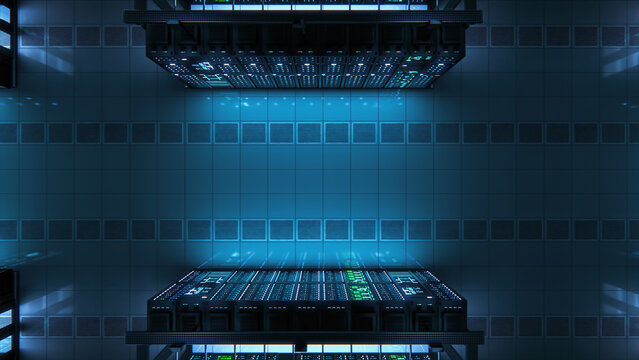 Modern Data Technology Center Server Racks Working in Dark Facility. Concept of Internet of Things, Big Data Protection, Storage, Cryptocurrency Farm, Cloud Computing. 3D Top Down Warehouse Render.