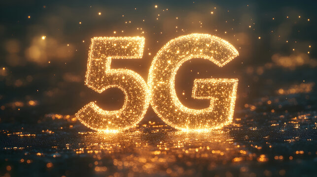 Low latency 5G technology – Glowing 5G Sign Illuminating a Dark Surface with Sparkles and Bokeh Effect