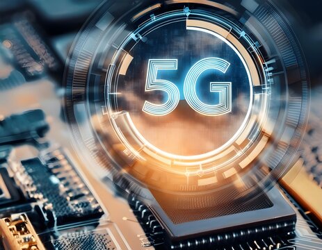Futuristic digital interface with glowing 5G network signal.
