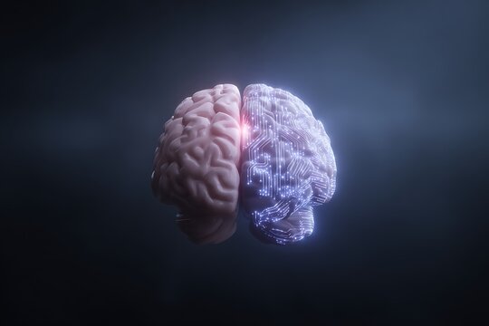 A digital brain with one half as a human brain and the other half as a circuit board, symbolizing artificial intelligence and the connection between human and machine