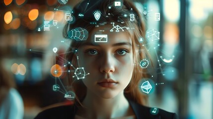 Woman with Technology Icons Surrounding Her Head