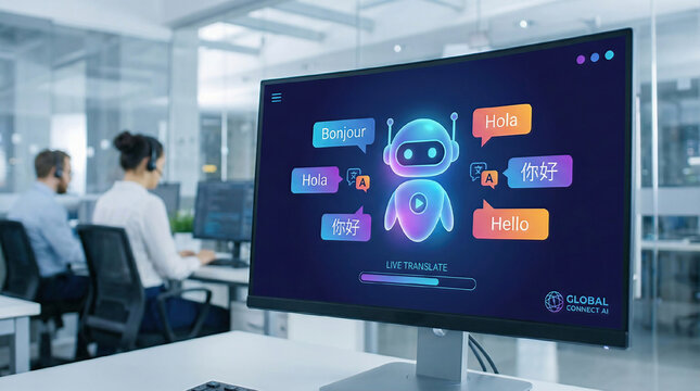 Digital chatbot interface translating several global languages, representing multilingual AI technology in customer service.